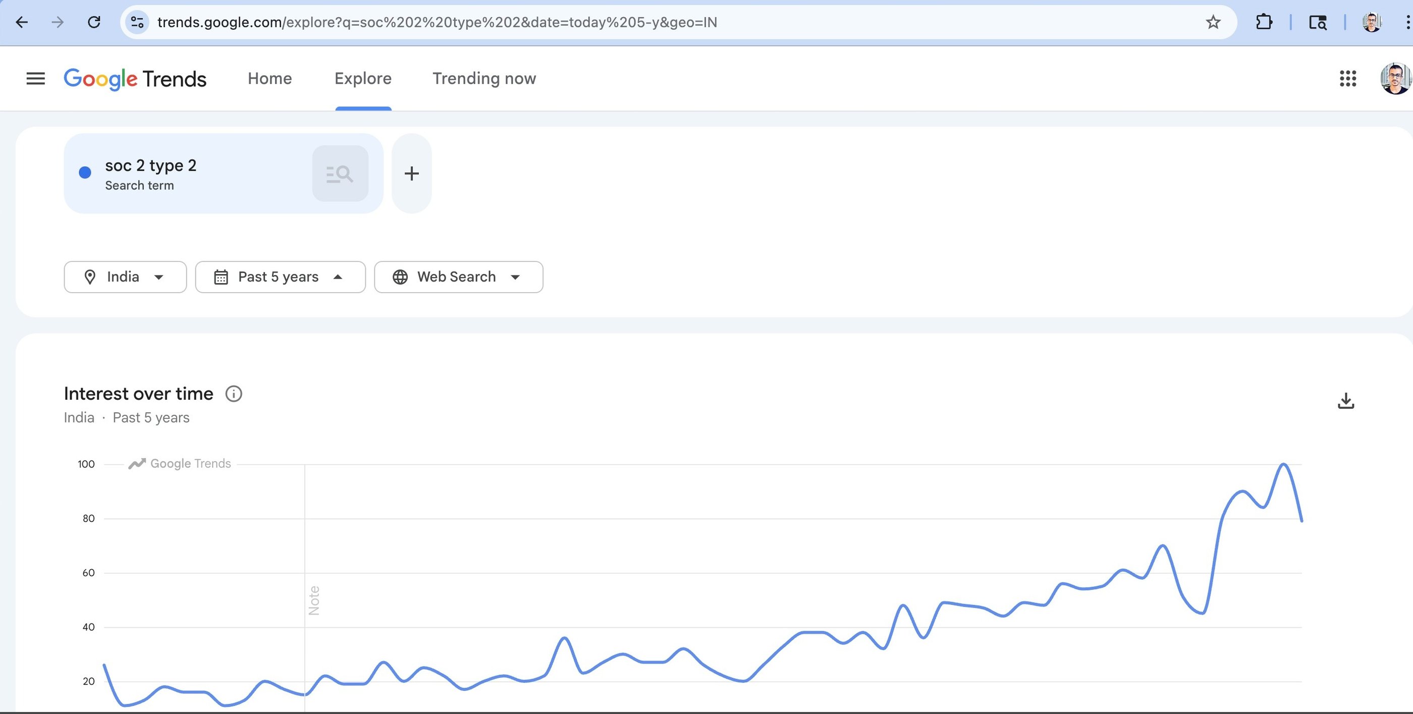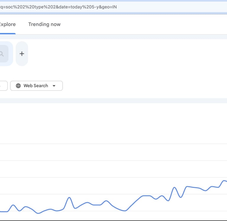 The screenshot from Google Search Trends showing the explosion of search terms related to SOC 2 Type 2 in India, since 2020